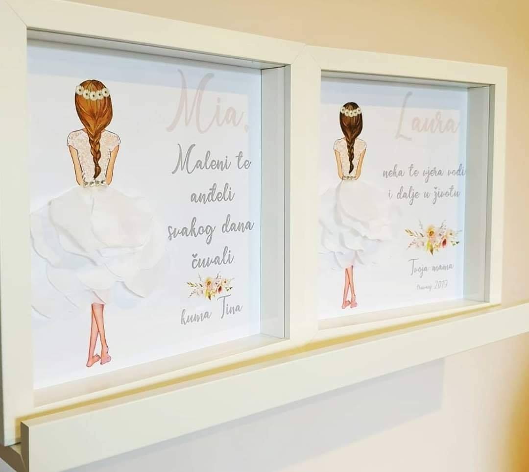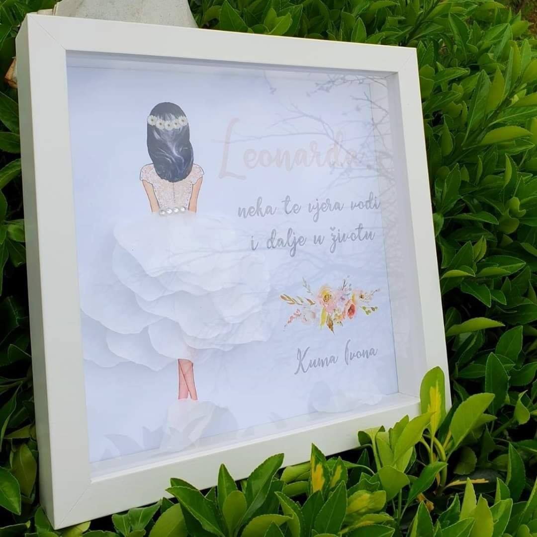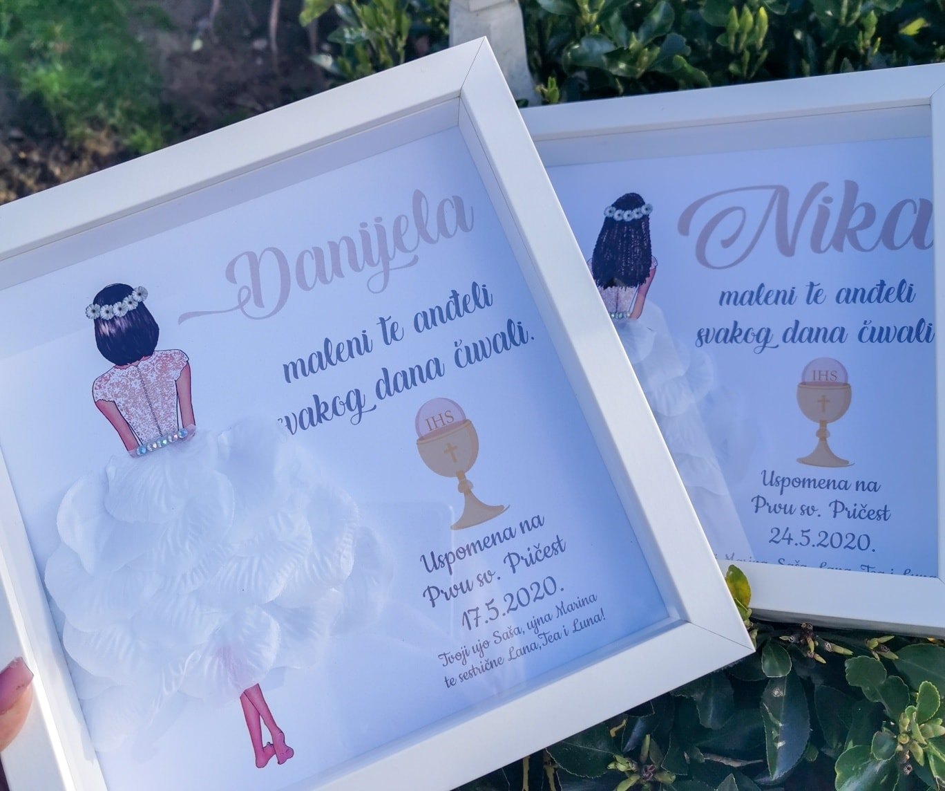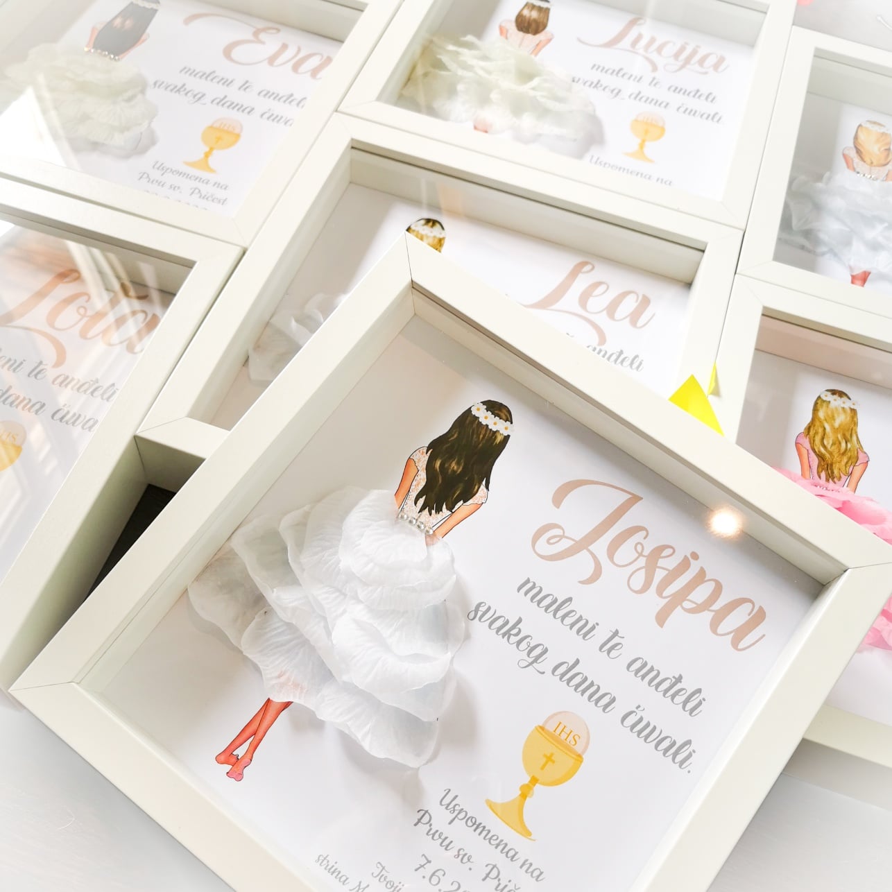 A beautiful personalized gift for the first Holy Communion and St. certificate with petals.