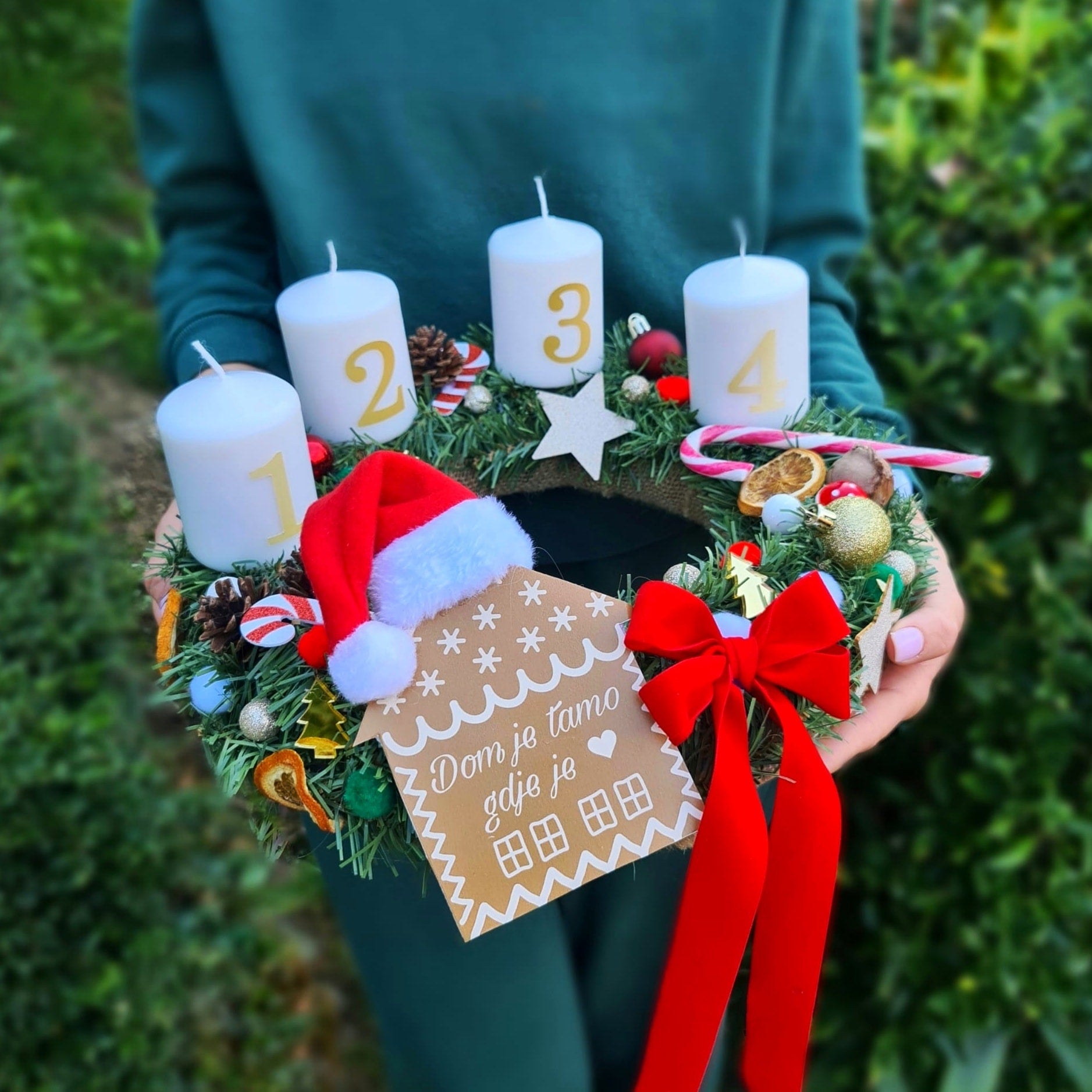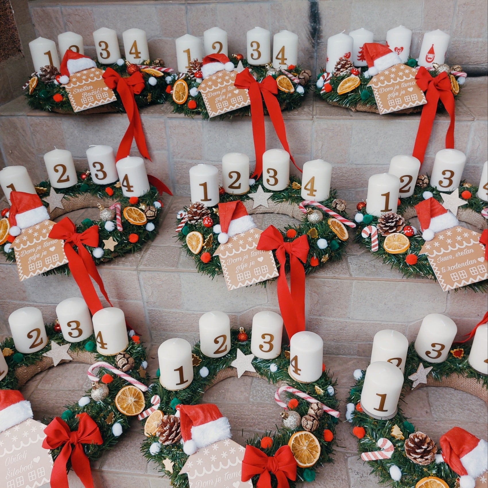 Na venčku so štirje kovinski podstavki (krožčki) za sveče, kot zaščita pred voskom, pa tudi zato, da naslednje leto, če želite imeti enak venček, nanje postavite nove sveče.